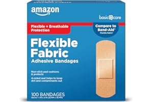 Amazon Basic Care Flexible Fabric Adhesive Bandages are designed to provide reliable protection for minor cuts, scrapes, and wounds. These bandages are made of a flexible fabric material that moves with your skin, ensuring comfort while keeping your injuries protected. The 100-count package contains all one-size bandages that adhere securely and are easy to remove. Ideal for home first aid kits, these bandages help to promote healing while providing a barrier against dirt and germs.