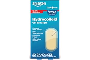 Amazon Basic Care Advanced Fast Healing Hydrocolloid Gel Bandages provide a protective barrier to help wounds heal faster. These adhesive wound care pads are designed to absorb moisture and create a moist healing environment, which can aid in faster recovery. Each bandage measures 0.83 x 1.65 inches and comes in a pack of 20, making them a convenient choice for treating minor cuts, scrapes, and blisters. The hydrocolloid technology helps to reduce pain and minimizes the risk of scarring.