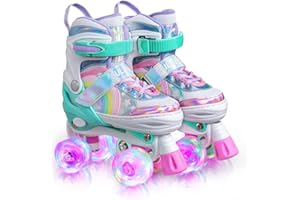 The SULIFEEL Rainbow Unicorn Light up Roller Skates are perfect for kids who love to skate in style! These adjustable skates come in four different sizes, allowing them to grow with your child. Featuring a vibrant rainbow unicorn design, these skates not only look great but also light up with every movement, making them fun and exciting for kids. The durable construction ensures safety and stability, while the comfortable fit means hours of enjoyment. Ideal for both beginners and experienced skaters, these roller skates make the perfect gift for any child.
