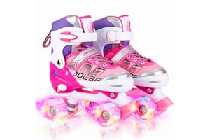 The Sowume Adjustable Roller Skates are designed specifically for girls and women, featuring a fun and vibrant design that includes illuminating wheels. With all 8 wheels shining brightly, these skates provide a safe and enjoyable skating experience for kids. The adjustable feature allows for a customizable fit, making them suitable for growing feet. Made with high-quality materials, these skates ensure durability and comfort for hours of skating fun.