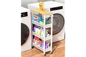 The OKZEST Utility Slim Storage Cart is a versatile and stylish solution for your storage needs. This 4-tier small rolling cart features a durable metal frame and a natural wood top, making it perfect for use in kitchens, laundry rooms, or bathrooms. Its slim design allows it to fit in tight spaces, while the wheels provide easy mobility. With ample storage space on each tier, you can organize your essentials efficiently and keep your areas clutter-free.