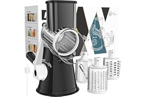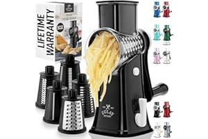 The Zulay Kitchen Rotary Cheese Grater is a manual hand crank cheese shredder designed for efficiency and ease of use. Featuring five interchangeable stainless steel blades, it allows you to grate, shred, or slice cheese and other foods quickly. The reinforced suction base ensures stability during use, preventing slips and spills. This versatile kitchen tool is perfect for cheese lovers, making it easy to prepare fresh toppings for pasta, salads, and more. Its compact design makes it easy to store, and it is simple to clean, making it a must-have for any kitchen.
