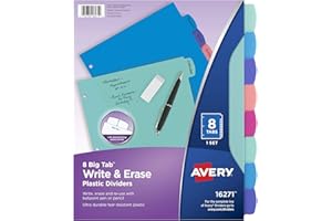 Avery Write & Erase Dividers for 3 Ring Binders feature 8 multicolor big tabs that are perfect for organizing your documents. Each tab can be easily labeled and written on with a dry-erase marker, allowing for quick updates and changes. The pastel colors add a touch of style to your binder while keeping your documents neatly separated. Ideal for school, office, or home use, these dividers help you stay organized and efficient.