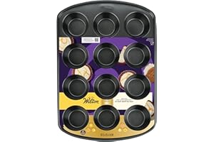 The Wilton Gold Premium Non-Stick Warp-Resistant Bakeware is designed to provide exceptional baking results with its durable construction. This 12-cup muffin pan ensures even heating and prevents warping, thanks to its high-quality materials. Made without PFAs, it promotes safer cooking practices while the non-stick surface allows for easy release of baked goods. Measuring 10.5 x 15 x 1.4 inches, it's ideal for baking muffins, cupcakes, and more, making it a versatile addition to any kitchen.