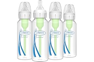 Dr. Brown's Natural Flow Anti-Colic Options+ Narrow Baby Bottles are designed to reduce colic, gas, and spit-up. This 4-pack of 8 oz/250 mL bottles comes equipped with Level 1 Slow Flow Nipples suitable for babies from birth onwards. The unique internal vent system allows for controlled air flow and helps preserve the essential nutrients in breast milk and formula. These bottles are dishwasher safe and made from BPA-free materials, ensuring safety and ease of cleaning.